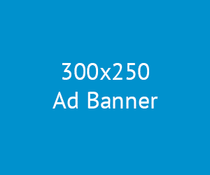 Placeholder ad banner with blue background and white text.