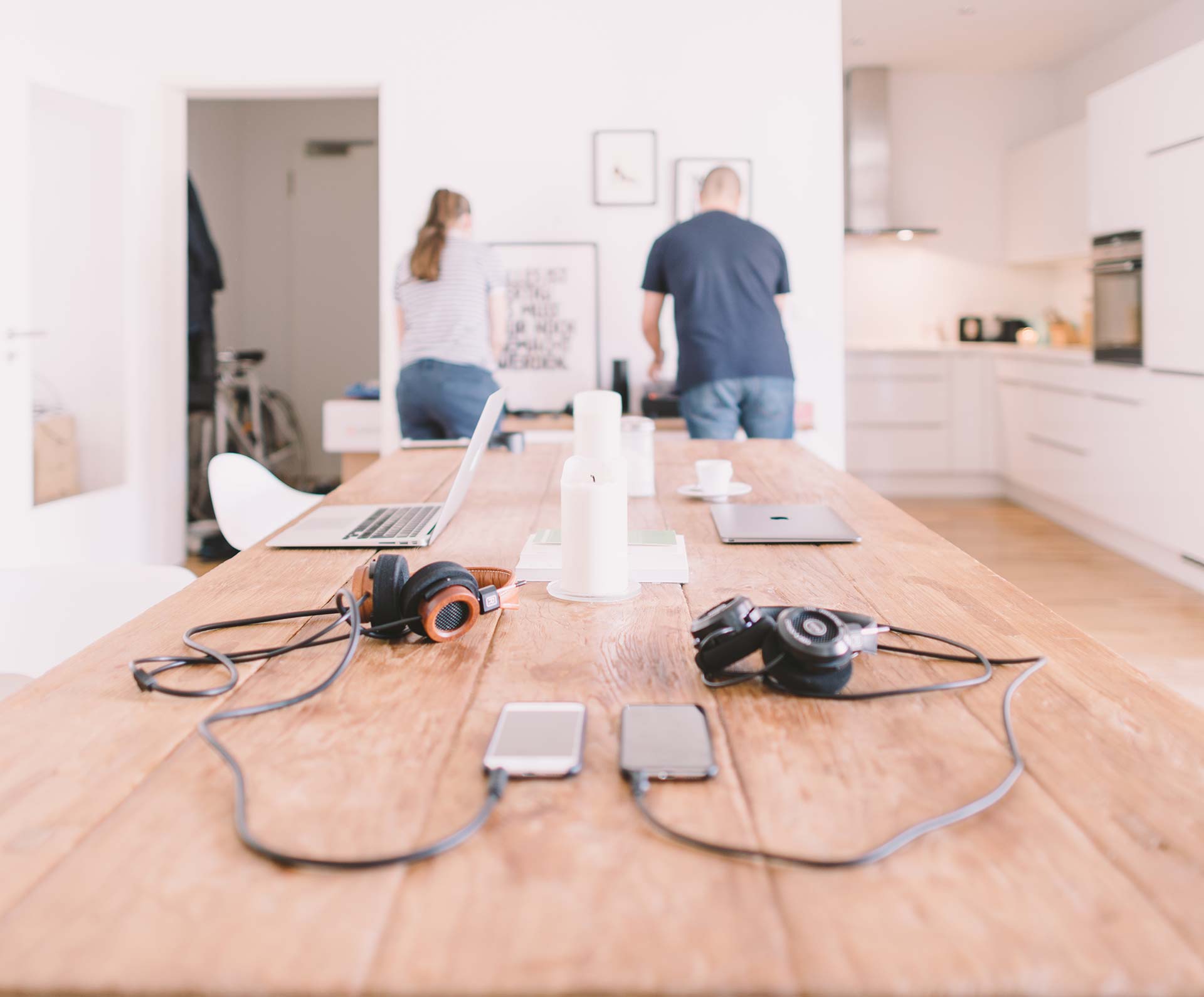 Two people working together in a modern kitchen with tech gadgets on the table.