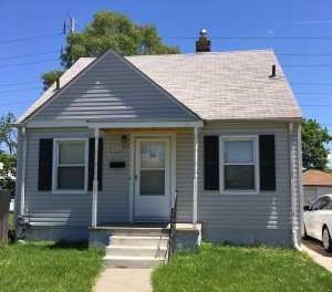 Small gray house with white trim and a front porch.