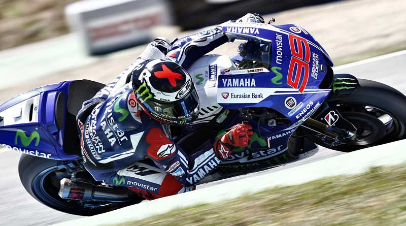 Motorcycle racer leaning into a sharp turn on a Yamaha bike.