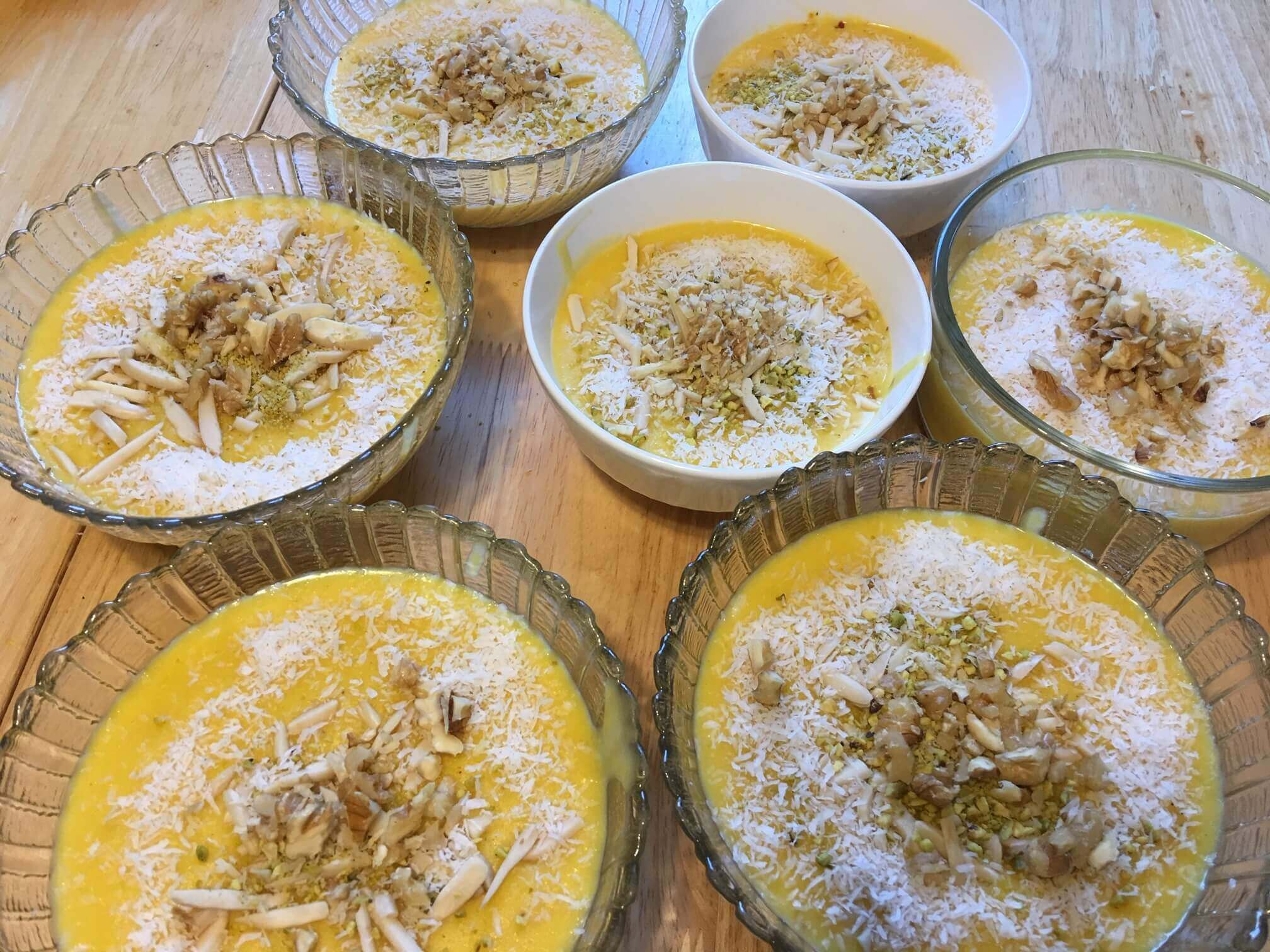 Bowls of creamy dessert topped with nuts and spices.