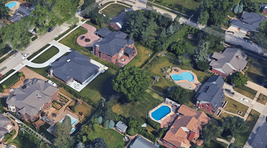 Aerial view of a suburban neighborhood with houses and swimming pools.