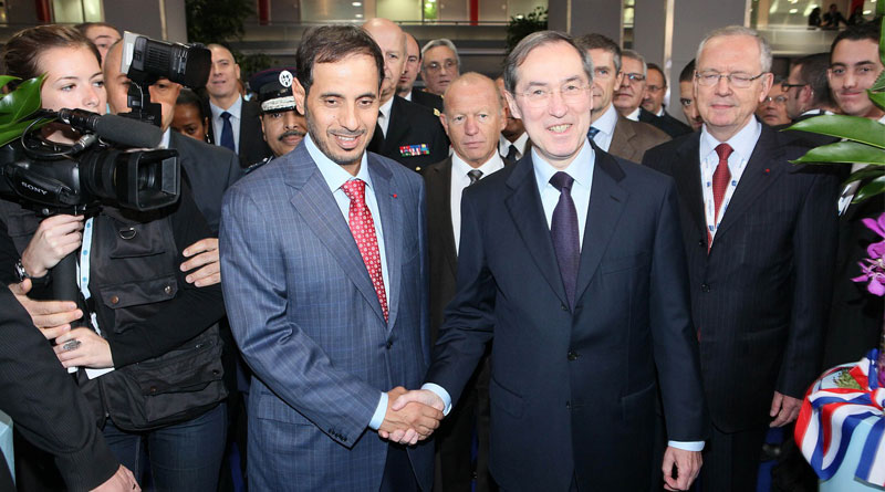 Two men in suits shaking hands in a formal setting.